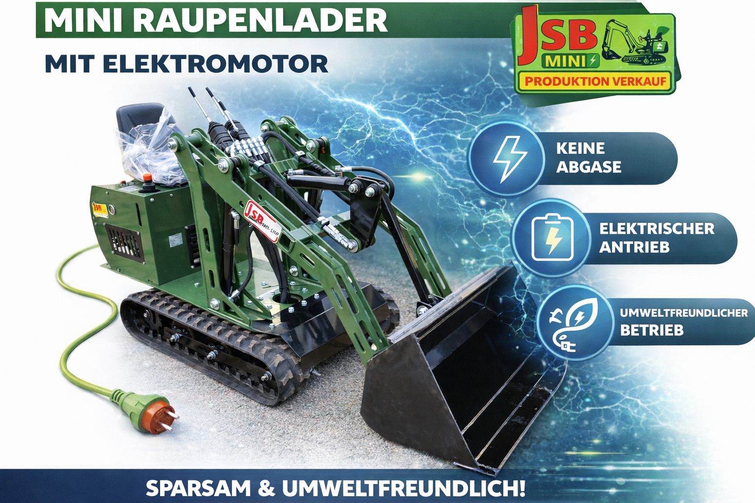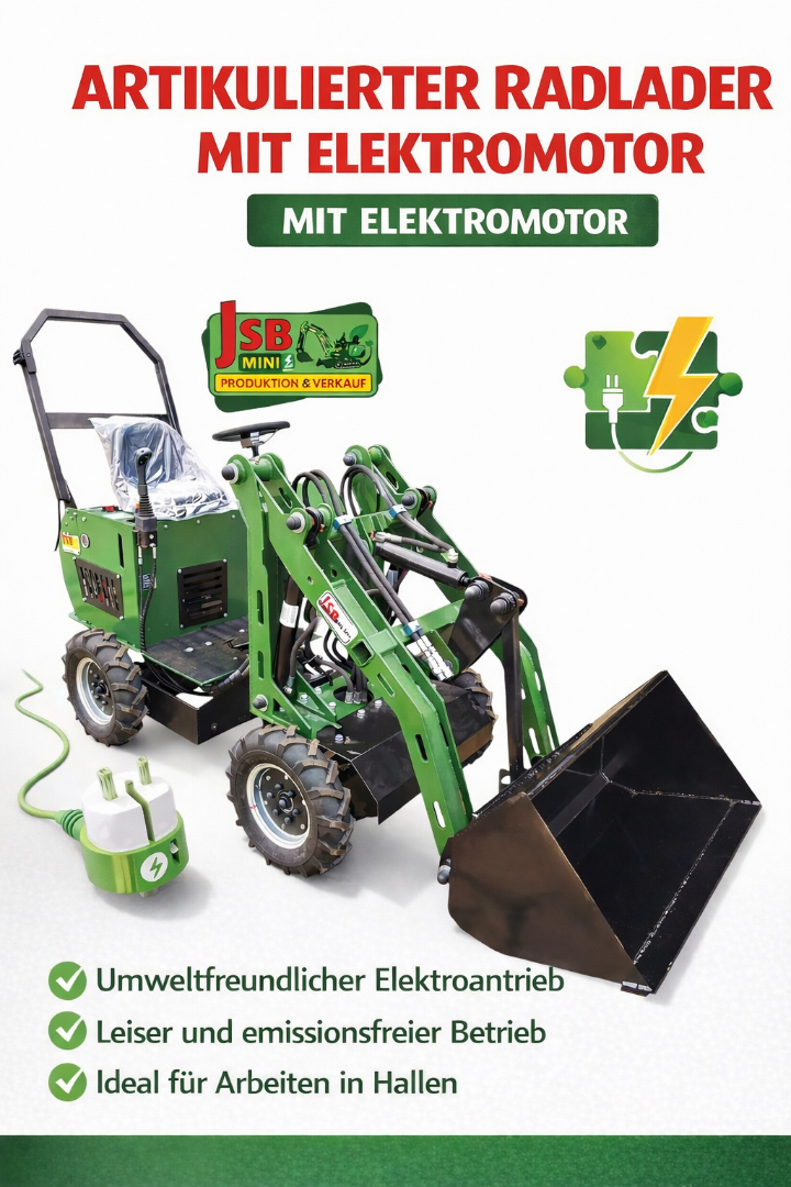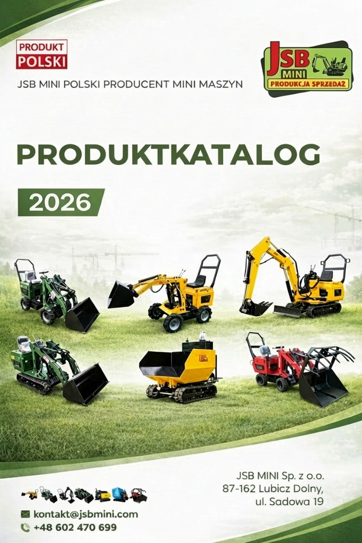Information über das Angebot Klickanzahl: 17Elektrischer E MINI RADLADER | GELENKRADLADER | RAUPENBAGGER | RAUPENLADER – NEU 2026 | Direkt vom Hersteller JSB NEUE elektrische Mini-Maschinen JSB – Modelle: MS-L116, MS-L116KN, MS-TE113, MS-TL113 | CE | Baujahr 2026 | ANGEBOT Wir bieten fabrikneue, in Polen hergestellte Minimaschinen mit elektrischem Antrieb an: Elektrischer E MINI RADLADER | GELENKRADLADER | RAUPENBAGGER | RAUPENLADER Ideal geeignet für Einsätze in: Landwirtschaft, Gartenbau, Obstbau sowie im Bauwesen. Zusätzlich führen wir auch kostengünstigere Modelle mit Verbrennungsmotoren (Benzin oder Diesel) als Alternative zu den elektrischen Versionen. Warum lohnt es sich? • Produktion in Polen – hohe Qualität und Zuverlässigkeit • CE-Zertifikat – sichere Nutzung • Elektrischer Antrieb – leise, umweltfreundlich und modern • Erweiterbare Batteriekapazität für längere Arbeitszeiten • Kompakte Bauweise – ideal für enge Einsatzorte • Garantie: 12 Monate (optional verlängerbar auf 24 Monate) • MwSt.-Rechnung und vollständiger Herstellerservice Technische Daten (Beispiel: MS-L116) • Baujahr: 2026 • Abmessungen: 1040 × 2300 × 1650 mm • Gewicht: 660–690 kg • Betriebstemperatur: -10°C bis +45°C • Elektromotor: 3–10 kW, Drehmoment: 70 Nm • Batterie: LiFePO4 12,8 V 200 Ah • Betriebsdauer: ca. 1 Stunde (bei 2 Batterien) Standardausstattung • Radladerschaufel 80–100 cm (modellabhängig) • Hydraulikanschlüsse für Hammer oder Bohrgerät • LED-Arbeitsbeleuchtung Arbeitsparameter • Hubhöhe: bis 200 cm • Schaufelabsenkung: bis -30 cm • Hydraulikleistung: 40 l/min, 160 bar, 2200 U/min Verfügbares Zubehör Baggerarm, Rasenmäher, Kehrmaschine, Greifer, Heu- und Palettengabeln, Schneepflug, Nivellierer, Hydraulikhämmer, Bohrgeräte, Bodenfräsen, Förderbänder, 4-in-1-Schaufeln und vieles mehr. Beispielmodelle • E mini RADLADER MS-L116 10.499 EUR netto • E mini GELENKRADLADER MS-L116KN 11.999 EUR netto • E mini RAUPENBAGGER MS-TE113 10.499 EUR netto • E mini RAUPENLADER MS-TL113 10.499 EUR netto Lieferung & Abholung ✔ Abholung in Berlin möglich ✔ Lieferung europaweit ✔ Transportkosten: 0,42 €/km netto (max. 420 € netto) Kontakt / Verkauf / Service JSB MINI Sp. z o.o. Ihr zuverlässiger Hersteller hochwertiger Minimaschinen Vertretungsberechtigter: Marcin Przyjemski Adresse: Batorego 61, 87-100 Toruń, Polen Telefon: +48 517 106 332 / +49 157 84875353 Website: www.JSBmini.com ✔ Besuchen Sie uns vor Ort oder unsere Händler in ganz Polen ✔ Maschinen sofort verfügbar ✔ MwSt.-Rechnungen werden ausgestellt eBay Shop: https://www.ebay.de/str/jsbminicom Produktkatalog: https://drive.google.com/file/d/1vNz3cv62rdy70EipP-Pa2TQWvbCHpoPJ/view?usp=drive_link