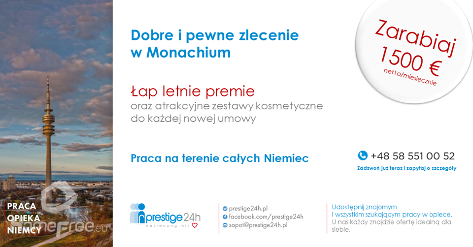Informacje o ofercie Liczba odsłon: 10581500 € miesięcznie na rękę + PREMIE LETNIE Mamy dla Was nasze stałe zlecenie w Monachium (wymiana). Nasza podopieczna to Pani Eleonora, która ma 88 lat. Porusza się na wózku inwalidzkim, ale co ważne pomaga przy transferze i waży tylko 65 kg. Seniorka ma inkontynencję i cierpi na zaburzenia rytmu serca. Jej hobby to książki, ale lubi też oglądać TV oraz chodzić do fryzjera :) Wymaga pomocy przy higienie, ubieraniu. Pomimo swojego wieku, stara się aktywnie uczestniczyć w życiu domowym i na miarę swoich możliwości chce być samodzielna. Mieszka wraz z mężem, który jest mobilny, ma do dyspozycji rollator. Wymaga jednak pomocy przy ubieraniu i kąpieli. Rodzina mieszka w domku jednorodzinnym, gdzie opiekunka ma do dyspozycji pokój z dostępem do internetu. Punkty handlowe znajdują się w odległości 15 min od domu. Zlecenie jest przygotowane dla spokojnej i doświadczonej Opiekunki, z komunikatywną lub dobrą znajomością języka niemieckiego. Dodatkowe szczegóły dotyczące zlecenia, warunków finansowych oraz stanu zdrowia, przedstawia koordynator. Start zlecenia: 10.08.2018. Wynagrodzenie: 1500 Euro miesięcznie na rękę + PREMIE LETNIE Zapraszamy do kontaktu! - Strona WWW: https://prestige24h.pl/ - Profil facebook: https://www.facebook.com/prestige24h - Telefon: +48 58 551 00 52 Prestige24h Sp.z.o.o. S.k. 81-874 Sopot, ul. Reja 13/15 NIP: 585-147-16-82, REGON: 362103426, KRS: 0000568660