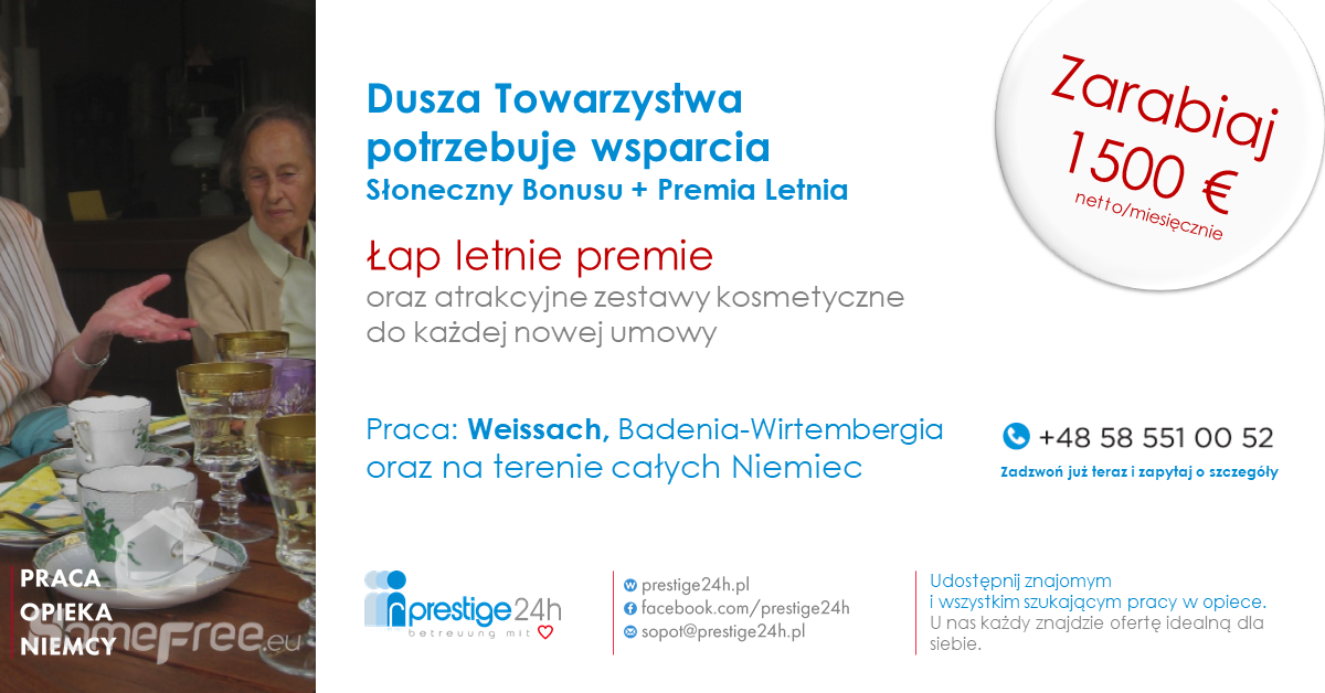 Informacje o ofercie Liczba odsłon: 11881350 € na rękę + 100 € Słonecznego Bonusu i dodatkowa Premia Letnia Poszukujemy Opiekunki z komunikatywną znajomością języka niemieckiego oraz prawem jazdy, do opieki nad Panią w wieku 80 lat. Seniorka mimo swojego wieku, prowadzi bardzo aktywny tryb życia. Jest osobą towarzyską, spotykającą się ze swoimi znajomymi, lubiącą gry towarzyskie, spacery oraz wieczorne oglądanie telewizji. Stara się poruszać samodzielnie, ale coraz częściej musi korzystać z pomocy rollatora. Zdarza jej się obudzić w nocy i poprosić pomoc. Występuje częściowa inkontynencja. Miejscem pracy jest dom jednorodzinny, gdzie Opiekunka ma do dyspozycji pokój z odrębną łazienką. Jest dostęp do Internetu, TV, radio. Samochód oraz rower do dyspozycji. W pobliżu miejsca pracy są punkty usługowo-handlowe. Dodatkowe szczegóły dotyczące zlecenia, warunków finansowych oraz stanu zdrowia, przedstawia koordynator. Start zlecenia: 08.08.2018. Wynagrodzenie: 1350 Euro / miesięcznie na rękę + PREMIE Miejscowość Weissach, Badenia-Wirtembergia. Położona w spokojnej okolicy, znanej m.in. z zabytkowej linii kolejowej i klasycznych parowozów. Jest to też rodzinne miasto kierowcy wyścigowego Herber Linge, który odnosił zwycięstwa m.in. w 24-godzinnym wyścigu Le Mans w latach 60-tych XX wieku. Zapraszam do kontaktu: - Strona WWW: https://prestige24h.pl/ - Profil facebook: https://www.facebook.com/prestige24h - Telefon: +48 58 551 00 52 Prestige24h Sp.z.o.o. S.k. 81-874 Sopot, ul. Reja 13/15 NIP: 585-147-16-82, REGON: 362103426, KRS: 0000568660