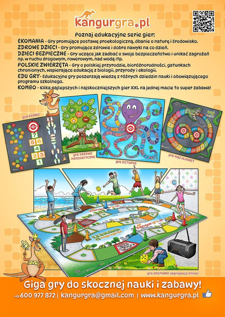Informacje o ofercie Liczba odsłon: 72Poznaj edukacyjne gry XXL do budowania postawy ekologicznej u dzieci i dorosłych. Granie to nauka przez zabawę i ruch na wielkich grach planszowych do skakania w wymiarze XXL. Gry z serii EKOMANIA kształtują oraz rozwijają właściwą postawę ekologiczną oraz wiedzę o ekologii i biologii, zwierzętach. Edukacyjne gry wielkoformatowe i maty edukacyjne dla dzieci do nauki, zabawy i skakania od KangurGra.pl to ekologiczna edukacja i pomoc dydaktyczna w szkole i przedszkolu. Eko gry z serii ekologicznej EKOMANIA zawierają zagadnienia z obowiązującego programu szkolnego. Zobacz edukacyjne gry XXL dla dzieci: www.kangurgra.pl https://kangurgra.pl/kategoria-produktu/seria-ekomania/ kangurgra@gmail.com - EKOMANIA czysta energia Gra uczy dzieci wiedzy o odnawialnych i ekologicznych źródłach energii. - EKOMANIA czyste powietrze Gra uczy dzieci jak chronić się przed smogiem, jak dbać o czyste powietrze i dobry klimat. - EKOMANIA segregacja śmieci Gra uczy dzieci jak segregować śmieci i dbać o środowisko. - EKOMANIA czysta woda Gra uczy dzieci jak chronić zasoby wody na ziemi i jak dbać o naturę i czystą wodę. - EKOMANIA ocieplenie klimatu Gra uczy dzieci wiedzy o ociepleniu klimatu, ziemi, geografii i przyrodzie. - EKOMANIA LAS Gra uczy dzieci wiedzy o lesie, ekosystemach i przyrodzie. - CHIŃCZYK segregacja śmieci Gra uczy dzieci jak segregować odpady i dbać o naturę. - POLSKIE ZWIERZĘTA / PTAKI / OWADY Gra uczy dzieci wiedzy o Polskich zwierzętach i gatunkach chronionych, płazach i gadach. - TWISTER OZE segregacja – zagraj w gimnastyczną grę, która uczy segregacji śmieci Jesteśmy producentem i twórcami integracyjnych gier xxl dla dzieci, do skakania. Oferujemy: - wielkie gry edukacyjne dla dzieci do nauki i zabawy, po których można skakać jak kangur - gry podłogowe, ogrodowe, plenerowe do szkół, przedszkoli, na świetlicę (np. klasy, twister, kalkulator, stópki i rączki etc.) - plakaty i maty edukacyjne, maty do animacji dla dzieci - duże GIERKI ogromne i ekologiczne gry stolikowe do szkoły i na świetlicę - eko gry jako klasyczne gry planszowe na prezenty i nagrody - edukacyjne strefy gier XXL dla dzieci i młodzieży - warsztaty z komiksu - warsztaty z projektowania gier https://www.kangurgra.pl/warsztaty.html - studio graficzne studiokomik.pl Gry KangurGra.pl są unikalne, ponieważ są to ręcznie malowane, autorskie projekty polskich artystów na najwyższym poziomie. Gry tworzymy pod okiem pedagogów i specjalistów. Można do gry dodać swoje logo, własne pytania a nawet kod QR – aktywny link. Gry od KangurGra.pl to dla dzieci super nauka i radość, połączone z ruchem i zabawą. Zapraszamy do owocnej współpracy. kangurgra@gmail.com www.kangurgra.pl 600977872 www.studiokomiks.pl (studio grafiki, komiksu i reklamy) www.artmedstudio.pl (ilustracje medyczne, naukowe, anatomiczne)