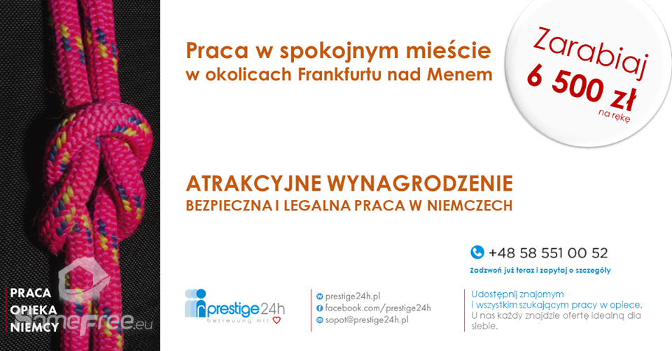 Informacje o ofercie Liczba odsłon: 1032To taka mała zagadka na dziś dla Was, od nas :) Prestige24h z Frankenthal łączy nasza podopieczna, dla której obecnie poszukujemy Opiekunki. Seniorka ma 84 lata. Starsza pani jest osobą ciepłą i sympatyczną. Od lat zmaga się z chorobą nowotworową płuc. Seniorka potrzebuje pomocy przy codziennej higienie, ubieraniu, prowadzeniu domu, zakupach i przede wszystkim silnego wsparcia psychicznego. Ulubione zajęcia, które wplecione są w rytm jej dnia, to: - poranne przeglądanie prasy, - spacer do parku - oraz popołudniowa drzemka poprzedzona czytaniem książki. Na zleceniu wymagana jest znajomość języka niemieckiego w stopniu komunikatywnym. Opiekunka musi koniecznie być osobą niepalącą. Mile widziane aktywne prawo jazdy. Miejscem pracy jest mieszkanie, gdzie osoba pełniąca opiekę ma do dyspozycji swój pokój oraz zapewniony jest dostęp do Internetu. Rower. Start zlecenia: 29.08.2018. Wynagrodzenie: 1270 Euro netto / miesięcznie. Dodatkowe szczegóły dotyczące zlecenia, warunków finansowych, przedstawia koordynator. Zapraszam do kontaktu: - Strona WWW: https://prestige24h.pl/ - Profil facebook: https://www.facebook.com/prestige24h - Telefon: +48 58 551 00 52 Prestige24h Sp.z.o.o. S.k. 81-874 Sopot, ul. Reja 13/15 NIP: 585-147-16-82, REGON: 362103426, KRS: 0000568660
