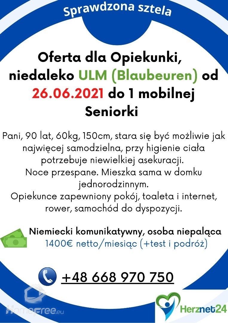 Informacje o ofercie Liczba odsłon: 678Oferta w Blaubeuren, ok. Ulm/ Bawaria Termin: 26.06.2021 - 6 tygodni Wynagrodzenie: 1400€ netto za miesiąc Zatrudnienie: umowa zlecenie, składki od średniej krajowej OPIS: Nasza Seniorka ma 90 lat, 60 kg, 150 cm. Nie ma demencji, jej umysł jest sprawny i klarowny. Samodzielnie korzysta z toalety oraz samodzielnie się myje. Porusza się samodzielnie oraz za pomocą rollatora. Podczas spacerów korzysta z wózka elektrycznego. Noce przesypia. Opiekunka dba o rytm dnia, kontroluje pory przyjmowania leków, robi zakupy oraz dba o czystość gospodarstwa domowego. Podopieczna mieszka sama w domku jednorodzinnym. Zakupy są osiągalne na pieszo. Jest dostępny również rower oraz samochód. Jeśli szukasz spokojną i niewymagającą pracę - jest to bardzo dobry wybór! Więcej informacji udzielę pod numerem telefonu: +48 668 970 750 ! Dane kontaktowe: Kontakt telefoniczny: +48 668 970 750 (Magda) Lub mailowy: kontakt@herznet24.eu Znajdziesz nas tu: Facebook: https://www.facebook.com/herznet.herznet Strona internetowa: https://www.herznet24.eu/