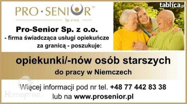 Informacje o ofercie Liczba odsłon: 653PRO-SENIOR Sp. z o.o. działa na rynku od ponad 11 lat. Jesteśmy wiarygodną i rzetelną firmą, która zapewnia pracę m.in. Opiekunom Osób Starszych w Niemczech. Firma tworzona jest przez zespół zaangażowanych oraz pomocnych osób. Obecnie poszukujemy osób chętnych do podjęcia pracy w charakterze: Opiekunka i Opiekun Osób Starszych w Niemczech. Opis stanowiska: Do obowiązków opiekunki/a należy m.in. kompleksowa opieka nad podopiecznym, wykonywanie prac domowych, robienie zakupów, towarzystwo, wychodzenie na spacery z podopiecznym, organizowanie czasu, wsparcie emocjonalne. Wymagania: - znajomość języka niemieckiego w stopniu min. podstawowym, - doświadczenie w opiece nad osobami starszymi poświadczone referencjami (mile widziane), - pozytywne i życzliwe nastawienie do podopiecznych , - prawo jazdy kat. B będzie dodatkowym atutem. Oferujemy: - atrakcyjne wynagrodzenie + premie, - ubezpieczenie, - legalne zatrudnienie, - opłacony transport, - darmowe zakwaterowanie i wyżywienie w miejscu pracy, - stały kontakt z naszym biurem w Opolu i kooperantem w Niemczech. Osoby zainteresowane ofertą prosimy o kontakt telefoniczny lub osobisty z firmą: Tel. 77 442 90 40 Tel. 77 442 83 38 Pro-Senior Sp. z o.o. , ul. Cygana 4/206 , 45-131 Opole , (Wpis do KRAZ 6933)