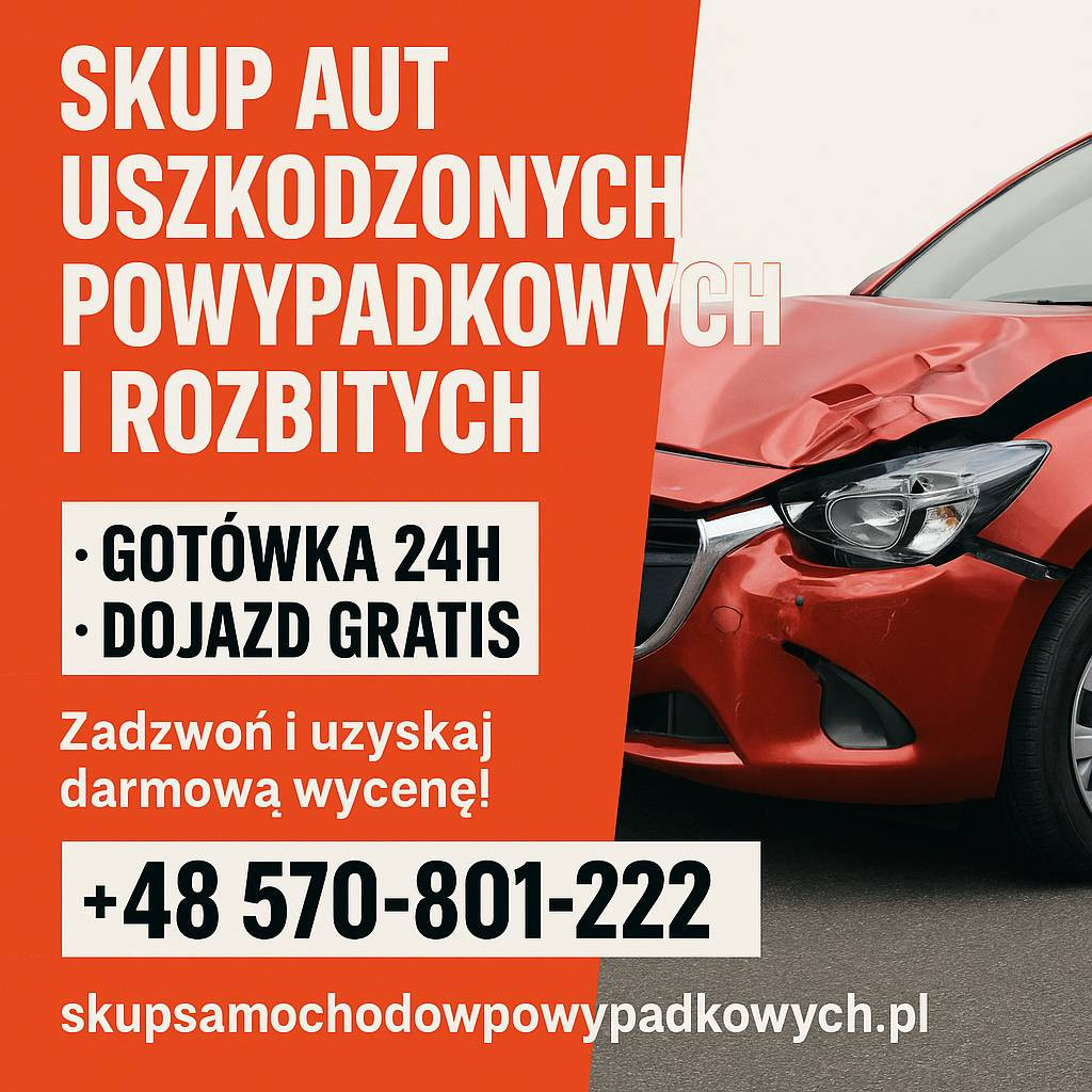 Informacje o ofercie Liczba odsłon: 108Skupujemy auta uszkodzone, powypadkowe i rozbite – w każdym stanie technicznym! Nieważne, czy samochód jest po kolizji, stłuczce, ma uszkodzony silnik, brak przeglądu czy OC - u nas go sprzedasz szybko i bez problemów! Gotówka od ręki - nawet w 24h! Dojazd na miejsce i odbiór auta - GRATIS! Minimum formalności - załatwiamy wszystko za Ciebie! Kupujemy: * auta powypadkowe, uszkodzone, rozbite * samochody osobowe, dostawcze, poleasingowe * auta bez OC, bez przeglądu, niesprawne * samochody po zalaniu, pożarze, z uszkodzonym silnikiem/skrzynią Zadzwoń i uzyskaj darmową wycenę już teraz! +48 570-801-222 https://skupsamochodowpowypadkowych.pl/