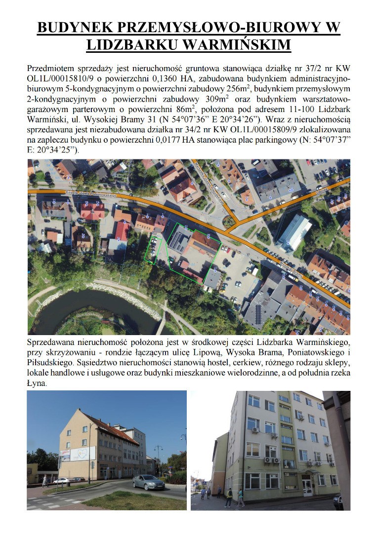 Informacje o ofercie Liczba odsłon: 132SYNDYK MASY UPADŁOŚCI WARMIŃSKA Sp. z o.o. sprzeda nieruchomość gruntową stanowiącą działkę nr 37/2 o pow. 0,1360 HA zabudowaną budynkiem przemysłowo-biurowym położoną w Lidzbarku Warmińskim przy ul. Wysokiej Bramy 31 dla której Sąd Rejonowy w Lidzbarku Warmińskim prowadzi księgę wieczystą KW nr OL1L/00015810/9 wraz z niezabudowaną działką nr 34/2 o pow. 0,0177 HA stanowiącą plac parkingowy przed budynkiem nr KW OL1L/00015809/9 - za cenę nie niższą niż 3/4 ich wartości oszacowania: 1.868.377,50 zł (wartość oszacowania: 2.491.170,00 zł). Sprzedaż prowadzona jest w formie konkursu ofert. Oferty pisemne, z podaniem proponowanej ceny należy składać w Kancelarii Notarialnej Zbigniewa Stankiewicza w Olsztynie przy ul. Dąbrowszczaków 18/4, tel. (89)527 32 30 - w terminie do dnia 8 sierpnia 2025r. Rozstrzygnięcie konkursu ofert nastąpi 13 sierpnia 2025r. o godz. 10.00. O wyniku oferenci zostaną powiadomieni listownie. Przystąpienie do konkursu oznacza zapoznanie się z regulaminem konkursu ofert i jego akceptacją. Syndyk zastrzega prawo swobodnego wyboru oferty a także unieważnienia konkursu bez podania przyczyn. Nieruchomość można oglądać po uprzednim uzgodnieniu terminu z p. Bożeną Mazurek tel. 600 472 178. Szczegółowe informacje oraz regulamin konkursu ofert jest dostępny w Internecie na stronie www.syndykolsztyn.com oraz www.syndykolsztyn.eu. Tel. do syndyka 502 957 530.